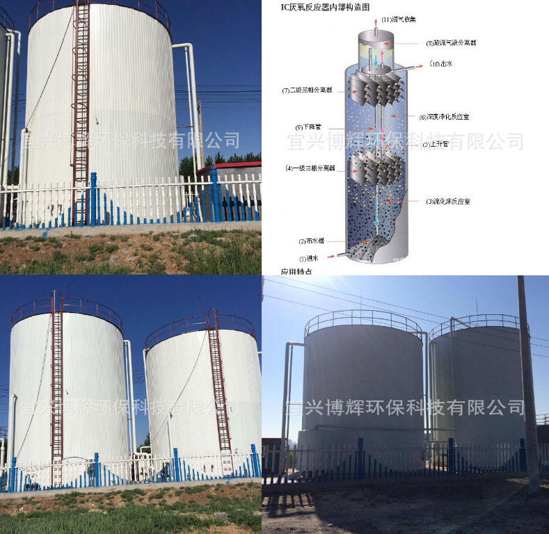 IC 的組成:厭氧塔塔體為Q235 碳鋼或不銹鋼304的圓筒型塔體,無分段連接法蘭。具體結(jié)構(gòu)由塔體、布水系統(tǒng)、污泥床、生物載體區(qū)、三相分離器、浮渣速排裝置和回流系統(tǒng)等組成。