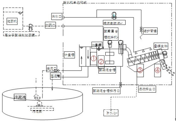 1、通過(guò)進(jìn)泥泵將污泥輸送至計(jì)量槽流入到絮凝混合槽,多余的部分從溢流管回流到污泥池。濾液從排出口排出。