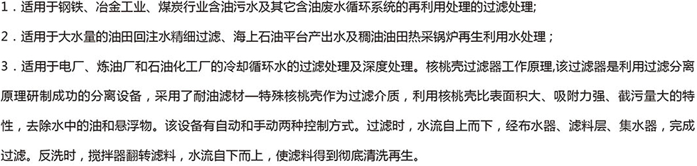 選用經(jīng)特殊加工的野生核桃殼為過濾介質(zhì),濾料化學(xué)性能穩(wěn)定(不宜被酸、堿腐蝕),強(qiáng)度高,抗壓能力強(qiáng)、耐磨性好,長期使用不需更換,截污能力強(qiáng),浸水性好且具抗油浸,能夠反洗再生,再生簡單方便,不需加藥且可直接使用濾后水反洗。