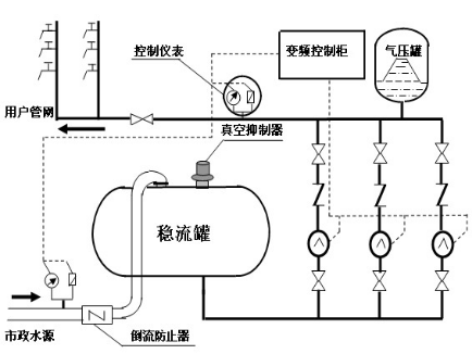 第二階段是采用“儲(chǔ)水池+水泵+壓力罐”的方法,市政來水進(jìn)入儲(chǔ)水池,然后由水泵加壓后送至壓力罐,由壓力罐向用戶供水,蓄水池起到高峰用水時(shí)調(diào)節(jié)作用;